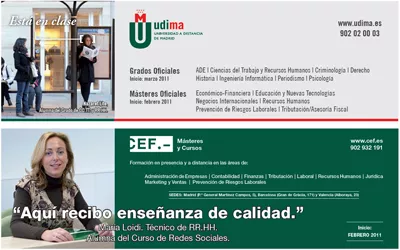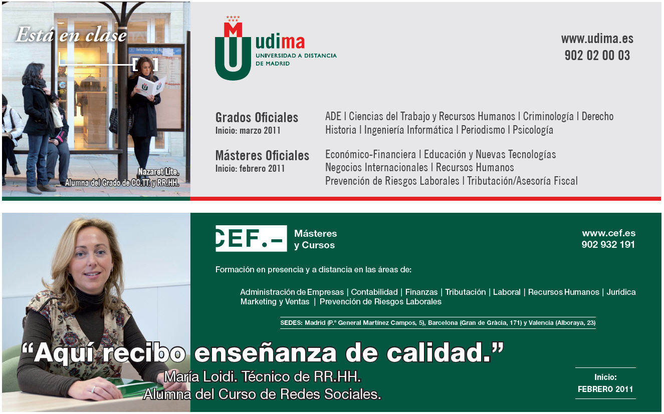 La nueva campaña publicitaria del CEF.- y de la UDIMA - Universidad a Distancia de Madrid - ha contado con unos modelos de excepción. Se trata de los propios alumnos de ambas instituciones, los cuales participaron el pasado mes de diciembre en una sesión fotográfica que ha servido para ilustrar los anuncios que CEF y UDIMA están publicando en estos días en diversos medios de comunicación.