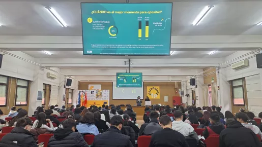 Por otro lado, la gran pregunta que plantearon a los estudiantes es ¿cuándo es el mejor momento para opositar? Una estrategia clara para motivar a los alumnos, pues entre 2022 y 2032 se prevé la jubilación de entorno al 60% de los funcionarios de la Administración General del Estado (cerca de 100.000 puestos quedarán vacantes a lo largo de este periodo, según la proyección que hizo el Ministerio de Hacienda y Función Pública).
