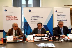 El presidente de la Mutualidad de la Abogacía, Enrique Sanz Fernández-Lomana, acompañado por Antonio Albanés Membrillo, secretario de la Junta de Gobierno y del director general de la institución, Rafael Navas Lanchas, presentaron este miércoles los resultados de la Memoria de actividades y el Balance de gestión del pasado ejercicio 2018, así como el presupuesto para 2019, cuya conclusión principal es el crecimiento de la entidad en un 10% durante 2018.